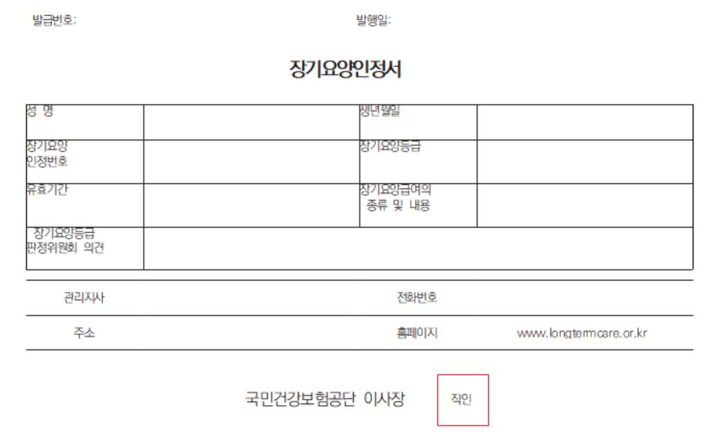 (1) 65세 이상 노인 또는 65세 미만 노인성 질환 대상자가 공단에 의사 또는 한의사가 발급하는 소견서를 첨부하여 장기요양인정 신청서를 제출합니다.